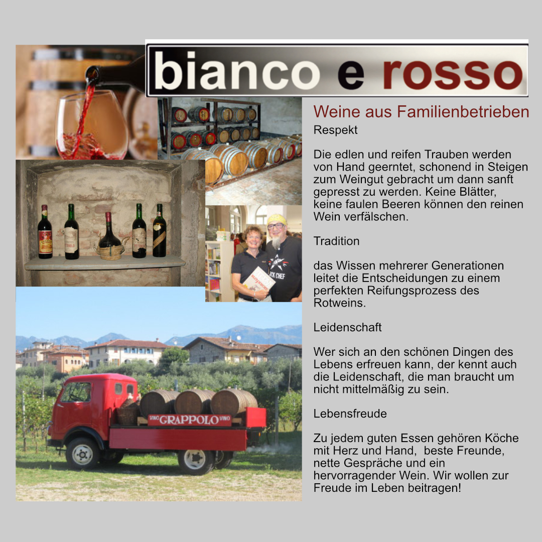 Essen und Trinken ist mehr als nur Nahrung zu sich zu nehmen, es ist Kultur, es ist Ausdruck einer Lebensfreude, einer Haltung. Wir lieben Wein und die befreudeten Produzenten unserer Top Qualitäten aus nachhaltigen Familienweingütern. Dafür stehen wir, das Team von bianco e rosso.