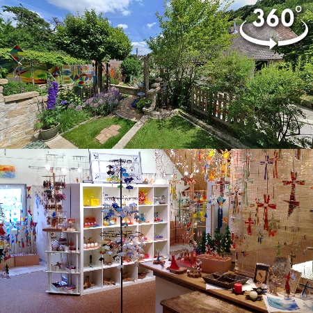 Gegenüber im Glas-Garten, der beschaulichen Umgebung, leuchten Glasstäbe und jede Menge andere bunte Objekte aus Glas weithin aus dem Grün und zeigen, was alles machbar ist mit dem kalten Werkstoff.