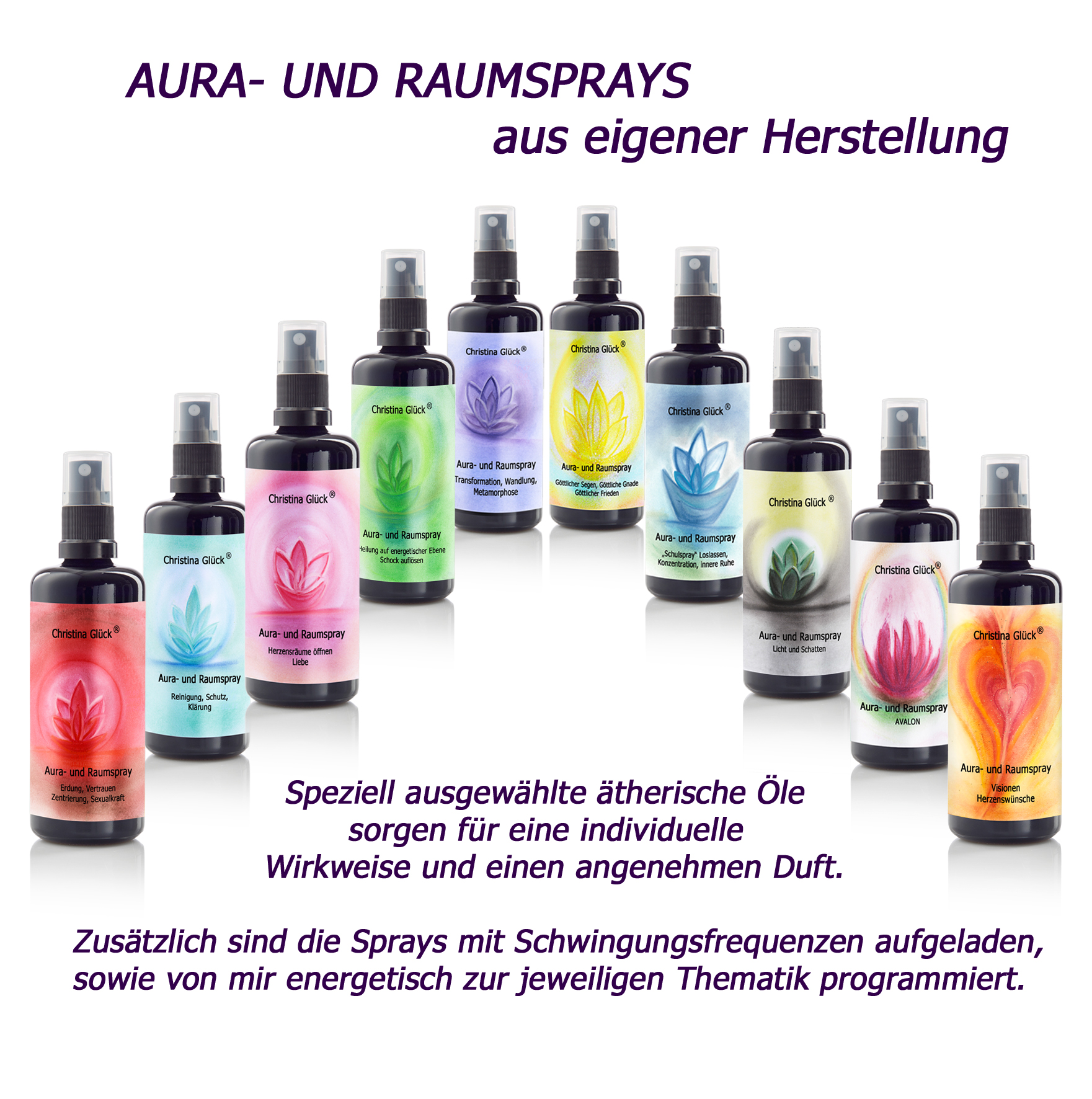 Ganz besonders freue ich mich über inzwischen zehn verschiedene Aura- und Raumsprays aus eigener Herstellung.