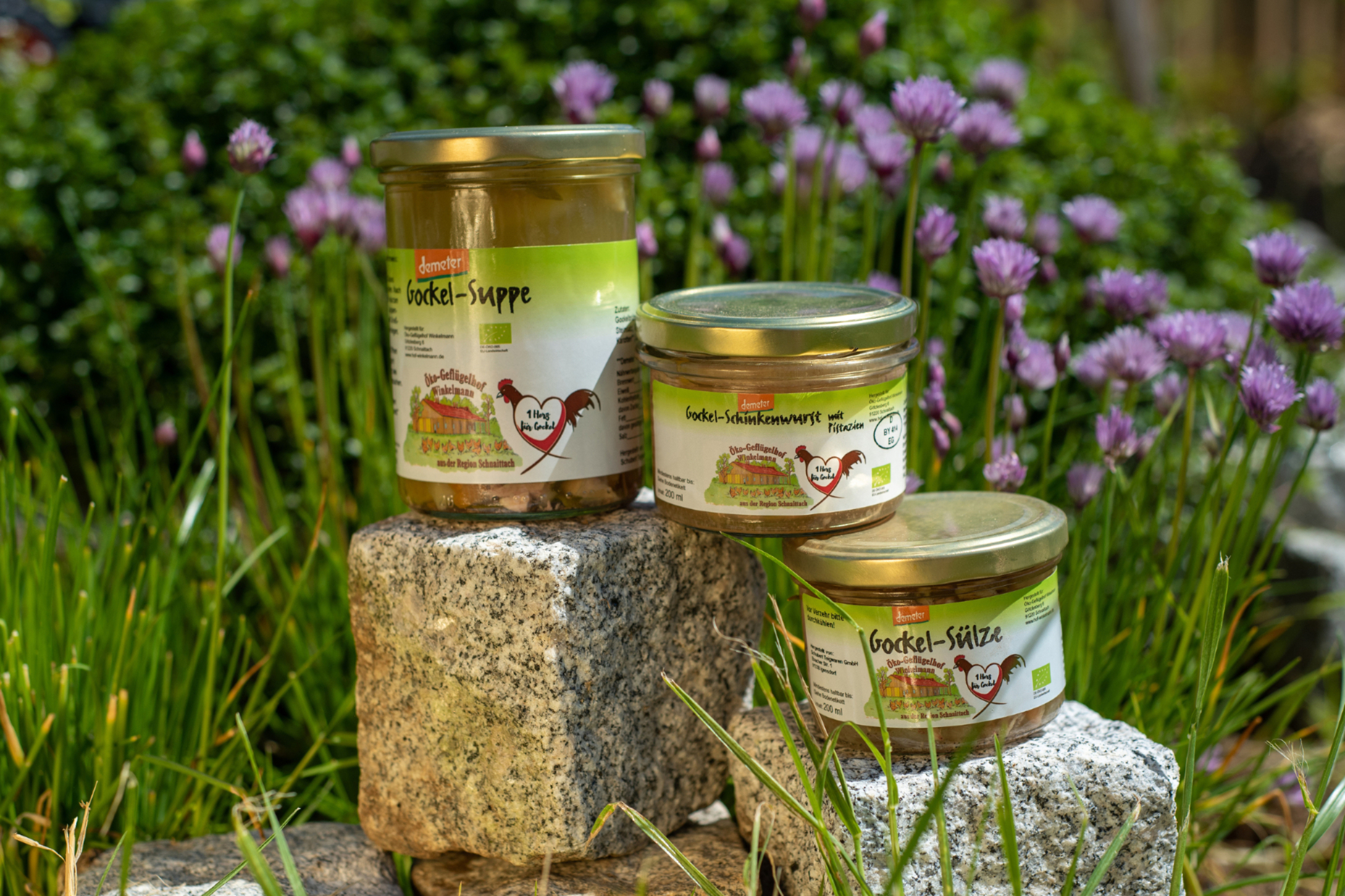 Sie erhalten bei uns feine Bio-Lebensmittel, deren Qualität man noch schmeckt: Eier, Nudeln, Eierlikör, Öle, Gockelfleisch- und -wurstwaren, Rinderwurst, Gockelfleisch, Suppenhühner, Rindfleisch, Honig.